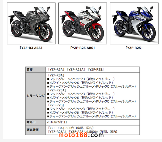 日本YAMAHA公司于2016/1/12宣布,即將在2016/2/1號發表即將推出R3 & R25的新配色