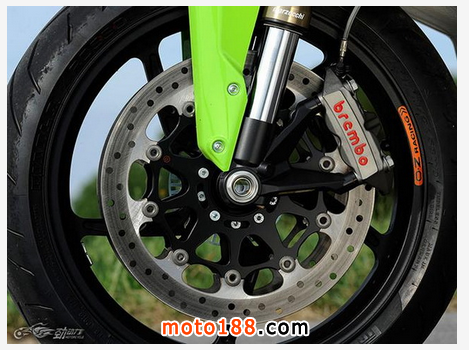 制動系統(tǒng)采用前320毫米雙鉆孔盤配Brembo對向4活塞直栓式卡鉗、后220毫米單鉆孔盤配對向雙活塞卡鉗,如此的配置對于高達(dá)260公斤的車重是完全必要的。實際的試駕中前后制動系統(tǒng)都感覺完全稱職。量產(chǎn)車還標(biāo)配了博世的ABS防抱死制動系統(tǒng)。