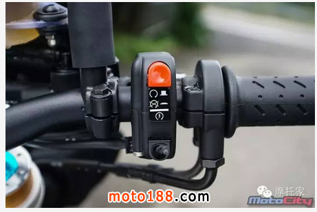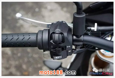 右手把開關.上方是引擎開關.下方是啟動鍵結合動力模式選擇功能 。