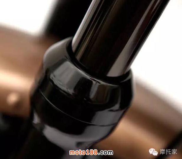 值得一提是該車的黑色電鍍前叉是這輛車改裝設計中的一個亮點,絕對獨樹一幟,Deus的深厚功底瞬間立顯無疑。