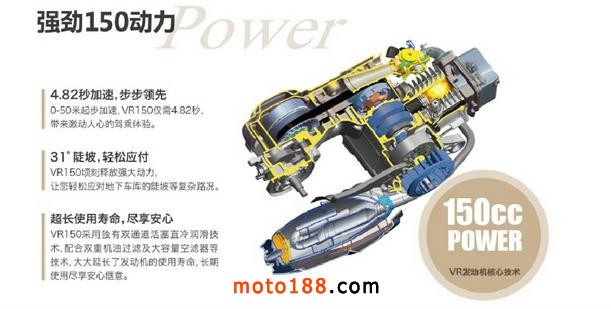 VR150是由豪爵國際化設(shè)計團(tuán)隊原創(chuàng)設(shè)計的一款踏板車。1330mm長軸距、12寸大前輪的大車體設(shè)計搭配虎臉式大燈、刀螂式車頭、游魚式后扶手等部件,VR150將運動感、力量感與科技感完美融合。200mm大直徑前碟煞、大型液晶儀表、LED尾燈、磁性密碼鎖、電子防盜器、大容量原 廠尾箱等等,令VR150的輕奢配置刷新了使用者對150綿羊的體驗。