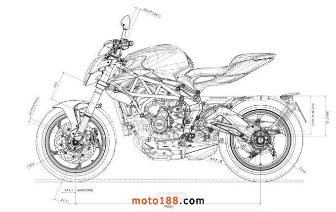 由此圖可以發(fā)現(xiàn),MV AGUSTA工程師為了求得更好的過彎穩(wěn)定性,將前叉頃角略為加大。為了彌補(bǔ)加大頃角后來帶來的神經(jīng)質(zhì),于是降低車輛軸線及更動(dòng)后搖臂角度,讓軸距也由前代的1380mm增加至1400mm,造就穩(wěn)定度及靈活性兼具的操控性格。