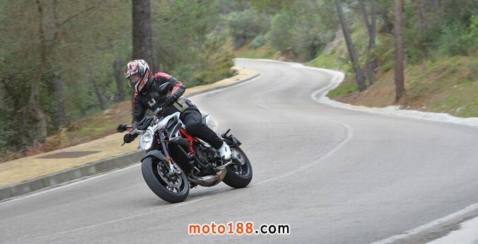 答案顯而易見!在Ronda山路上,大多是可以用100km/h左右的速度進(jìn)出的彎道,照理說,軸距短的車輛在高速過彎的穩(wěn)定性較差,但在New Brutale 800上,這樣的缺點(diǎn)卻不明顯,甚至有時(shí)我會(huì)懷疑這輛車的軸距是不是有官方聲稱的短,無論是高速或是低速彎,只要到了進(jìn)彎點(diǎn),完成煞車動(dòng)作,啪!的一聲,車輛以平穩(wěn)的姿態(tài)進(jìn)出每個(gè)彎道。