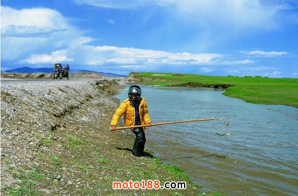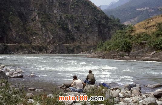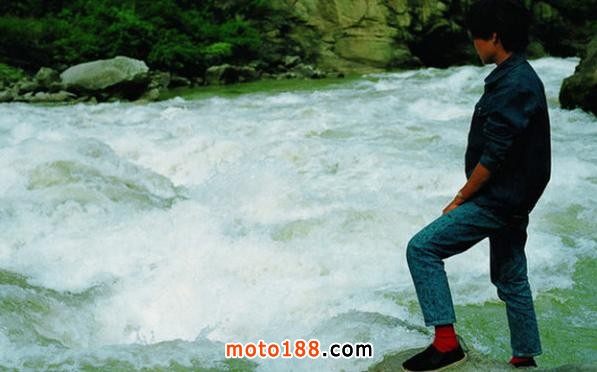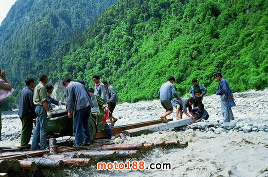 我們過完險路到達了河邊,但是橋已經(jīng)被水沖毀,前邊過去的車給道班工人錢,工人們修了一座臨時橋,那車過去后工人拆掉幾根木頭,后來的車想過還得付錢,我們的車小,給道班工人200元(貌似是的),請他們把摩托車抬過去,抬車過河的時候,張一不小心掉進河水,雖然他水性很好,轉(zhuǎn)眼湍急的水流就把他沖出去好遠,何當時立即跳入水里,幫他爬上岸來。