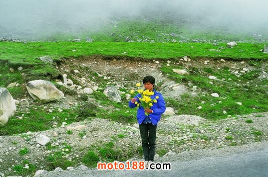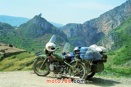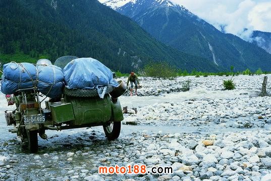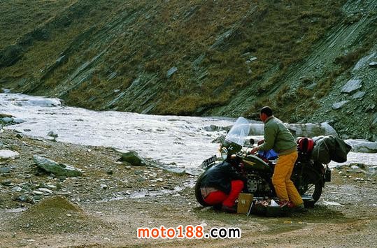 一輛摩托車坐三個人,還要帶3個大睡袋,睡袋和羽絨服都是四川一個羽絨服廠贊助我們的,因為據(jù)說是廠長的弟弟去美國是何的朋友給做的擔(dān)保,睡袋很大直徑有30公分,還帶了頭盔帳篷瓦斯爐還有一些修車配件,頭盔帳篷瓦斯爐是何飛到香港采購的,為了能過帶上足夠的汽油,請人在摩托車中間加了一個1.7米長的副油箱,由于沒有聽說過高反,我們只帶了感冒藥和治拉肚子啥的藥,最多是帶上了一些蜂王漿膠囊,出發(fā)那天我們整整裝了一天車,東西太多車太小,我坐在跨斗里,腳下放著東西,懷里也抱著東西。