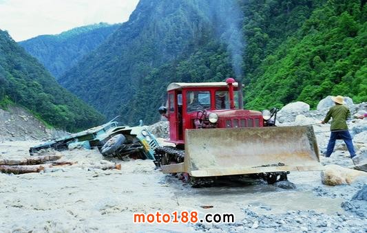 要通過最危險的路段大約有8公里,大部分是上坡,因為夜里下雨,路邊的山體很多都塌下來,這時摩托又不愿走了,我們仨人只好下來,掛一檔推著摩托車上山,一邊走一邊等著推土機把前邊路上的落石和土推開,我當時害怕的要命,特別希望立刻離開這段險路,當終于走過這段路的時候,我覺得自己就像重新活過一次,那份輕松和欣喜無法用語言來形容。