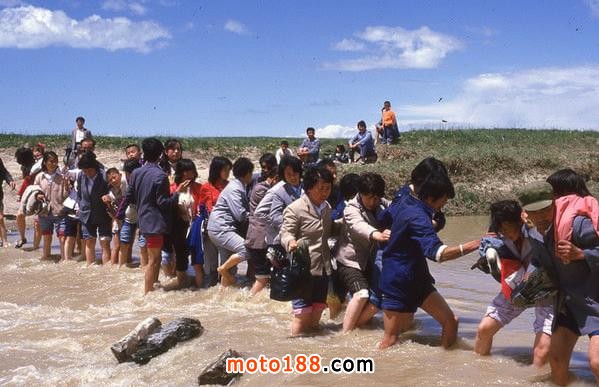 只可惜通往鳥島的路被大水沖壞了,大家涉水過河,看人們緊張的樣子,你就知道水有多急了。
