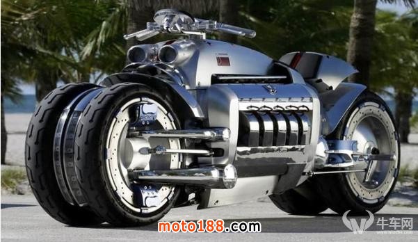 美國本土肌肉車品牌道奇旗下的摩托車——道奇戰斧,也是個稱王稱霸的角色。這款車的獨特之處在于它像汽車一樣,配備了4個輪子,但前后車輪都是成對的靠在一起,所以從側面來看,還是傳統摩托車的樣式,這四輪提供了極強的穩定性,配合著10缸的發動機,最高速度約可達640公里/小時。當然,如此彪悍的車子,價格也相當不菲,約為人民幣350萬左右,令人咋舌啊!