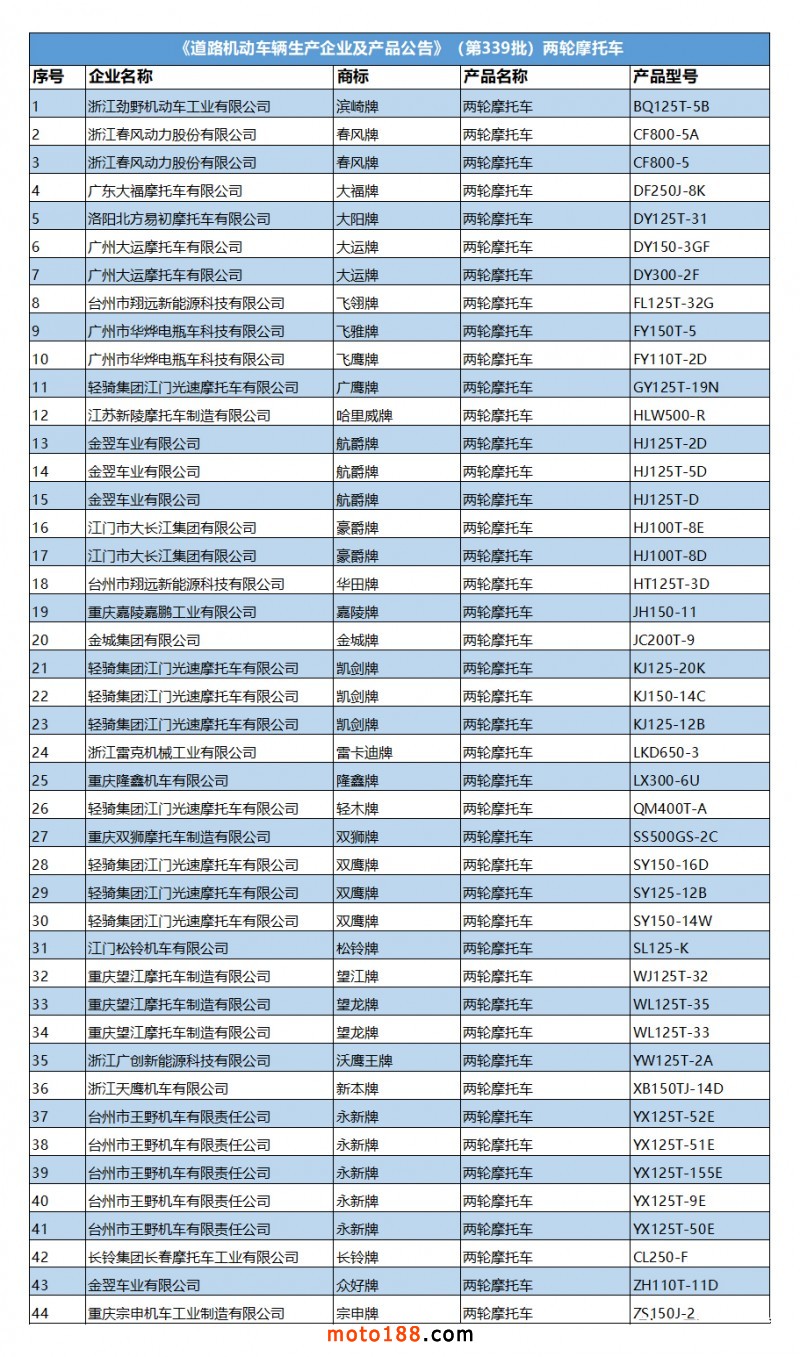 第339批公示兩輪摩托車品牌包括:濱崎牌春風牌、大福牌、大陽牌、大運牌、飛翎牌、飛雅牌、飛鷹牌、廣鷹牌、哈里威牌、航爵牌、豪爵牌、華田牌、嘉陵牌、金城牌、凱劍牌、雷卡迪牌、隆鑫牌、輕木牌、雙獅牌、雙鷹牌、松鈴牌、望江牌、望龍牌、沃鷹王牌、新本牌、永新牌、長鈴牌、眾好牌、宗申牌,能上牌的44款產品型號見圖1。