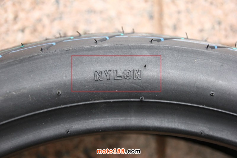 如圖所示,NYLON字母表示,該輪胎的胎面結構為尼龍材質,有的稱為尼龍輪胎,輪胎的胎體簾布層、由數層掛膠簾布組成, 4P.R.代表的是采用4層簾線的結構方式,當然層數越多載重能力越強,通常摩托車還有子午線輪胎可以選擇,也就是俗稱的鋼絲胎,胎體和帶束層是由多層鋼絲簾布組成,有著強度高,負載能力大的優勢,子午線的輪胎用符號R表示。
