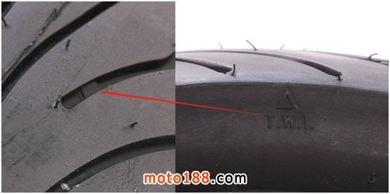 輪胎邊緣處通常有TWI標志,平行對應到輪胎花紋里凸起的地方,就能直觀的看到磨損程度。當磨損到花紋凸起時、基本上已到達極限安全范圍,應該及時更輪胎、避免安全隱患。