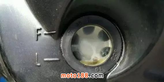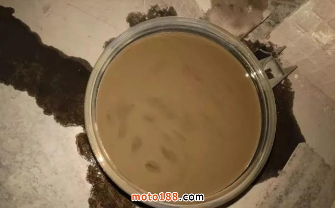 機(jī)油嚴(yán)重乳化現(xiàn)象時(shí)(如下圖),就必須立即更換新機(jī)油(有條件的可以用專用摩托車發(fā)動(dòng)機(jī)清洗劑清洗一遍),以免乳化后的機(jī)油特性失效,導(dǎo)致發(fā)動(dòng)機(jī)故障。