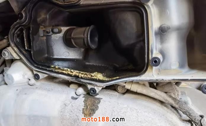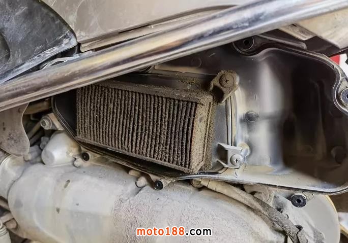 一位踏板車用戶就不知什么時候將排污孔塞拔除了,而且此用戶對于摩托車保養非常不嚴謹,我們來看空氣濾清器內部: