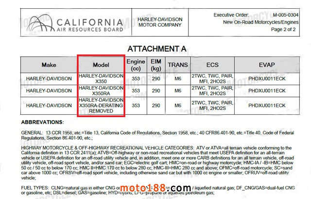 該車由排量353cc的雙缸水冷發(fā)動(dòng)機(jī)提供動(dòng)力,但是這臺(tái)發(fā)動(dòng)機(jī)不是全新的,而是QJMOTOR追350的同款發(fā)動(dòng)機(jī),發(fā)動(dòng)機(jī)的缸徑和沖程都是相同的。根據(jù)國內(nèi)的申報(bào)信息顯示,最大輸出功率為27kw,也就是36匹馬力,但是哈雷戴維森VIN信息證實(shí)X350RA的輸出功率僅為23匹馬力。加州空氣資源委員會(huì)發(fā)布的行政命令,進(jìn)一步證實(shí)RA型號(hào)馬力已受到限制,而X350才是全功率版本,這也是為什么會(huì)有兩個(gè)型號(hào)的原因。