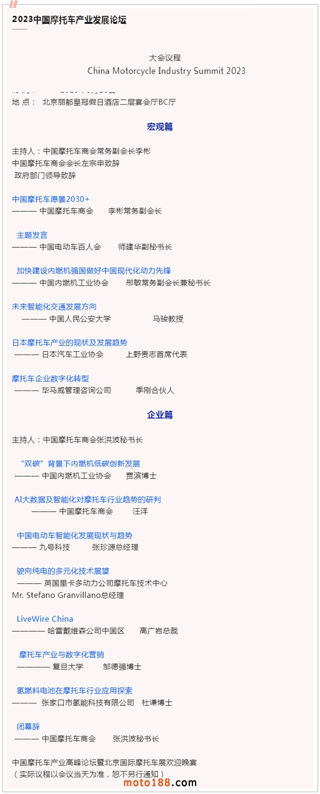 主題為“中國摩托車愿景2030+”的“中國摩托車產業發展論壇”將于5月18日在北京隆重召開, 論壇由中國摩托車商會主辦,一年一次,是中國摩托車界最重要的交流和溝通平臺。我們邀請了著名經濟學家,最先進的摩托車制造商,資深摩托車研發機構以及與新型互聯網企業等眾多行業精英,就行業的發展趨勢,智能交通,新能源以及新數字營銷模式等熱點議題進行高質量的研討,同期還將舉辦2023北京國際摩托車展覽會。