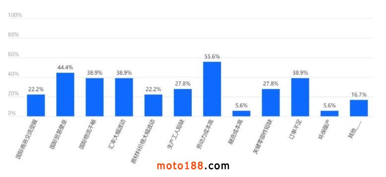 今年一季度,企業(yè)外貿(mào)業(yè)務(wù)遇到的問題主要集中在:勞動力成本高(55.6%)及國際貿(mào)易壁壘(44.4%)等方面。
