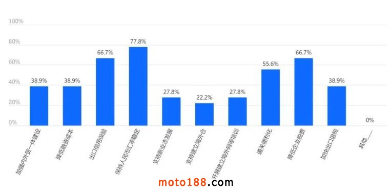 針對目前的生產(chǎn)經(jīng)營狀況,企業(yè)希望政府出臺的主要措施有:保持人民幣匯率穩(wěn)定(77.8%)以及出口信用保險(66.7%)和降低企業(yè)稅費(66.7%)等方面。