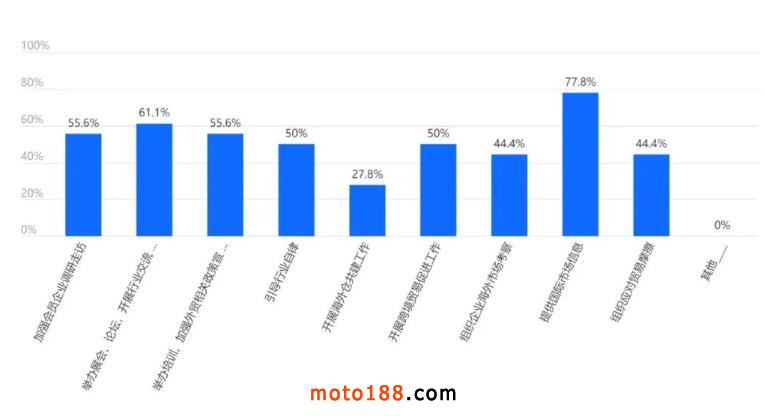 企業(yè)希望今后商會能重點開展的工作主要有:提供國際市場信息(77.8%)及舉辦展會、論壇,開展行業(yè)交流活動(61.1%)等。