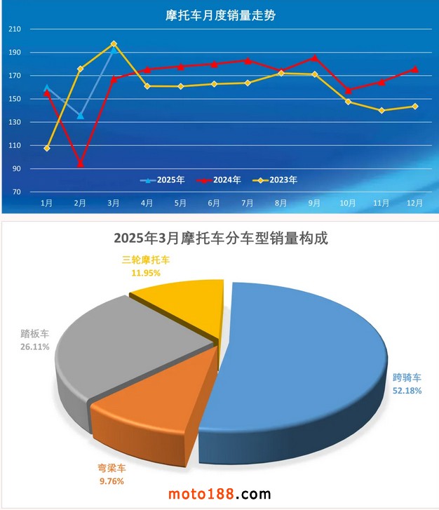 3月,從車型明細(xì)來看,三大車型中,跨騎車產(chǎn)銷100.07萬輛和97.14萬輛,產(chǎn)銷量環(huán)比增長50.33%和39.19%,同比增長23.02%和26.01%;踏板車產(chǎn)銷53.19萬輛和52.02萬輛,產(chǎn)銷量環(huán)比增長48.79%和41.26%,同比下降0.13%和1.87%;彎梁車產(chǎn)銷18.03萬輛和18.03萬輛,產(chǎn)銷量環(huán)比增長33.63%和39.23%,同比增長29.96%和40.49%。