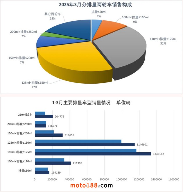 3月,出口量位居前六位的系列品種為:125系列(110ml<排量≤125ml)、150系列(125ml<排量≤150ml)、110系列(100ml<排量≤110ml)、200系列(150ml<排量≤200ml)、50系列(排量≤50ml)和250系列(200ml<排量≤250ml),分別出口35.06萬輛、32.58萬輛、12.58萬輛、10.31萬輛、4.72萬輛、3.14萬輛。與去年同期相比,125系列增長36.44%,150系列增長16.44%,110系列增長30.07%,200系列同比增長51.15%,50系列增長80.16%,250系列增長3.12%。