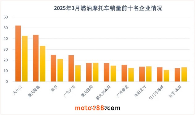 一季度,燃油摩托車銷量前十名企業(yè)(集團(tuán))為大長江、隆鑫、宗申、廣東大冶、重慶銀翔、新大洲本田、廣州豪進(jìn)、洛陽北方、江門市珠峰、五羊-本田,分別銷售52.16萬輛、43.5萬輛、24.94萬輛、24.64萬輛、17.39萬輛、17.33萬輛、15.69萬輛、13.92萬輛、13.37萬輛和12.56萬輛。