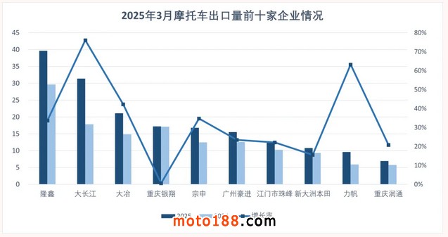 一季度,摩托車出口量排名前十位的企業(yè)依次為:隆鑫、大長江、廣東大冶、重慶銀翔、宗申、廣州豪進(jìn)、江門市珠峰、新大洲本田、力帆、重慶潤通,上述十家企業(yè)共出口181.55萬輛,占摩托車出口總量的62%。