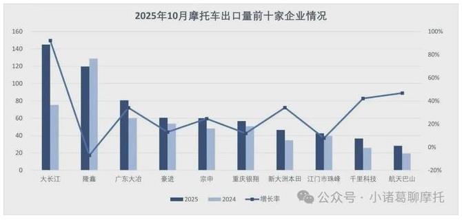 1-10月,摩托車出口量排名前十位的企業依次為:大長江、隆鑫、廣東大冶、廣州豪進、宗申、重慶銀翔、新大洲本田、江門市珠峰、重慶千里科技、航天巴山,上述十家企業共出676.34萬輛,占摩托車出口總量的61.38%。