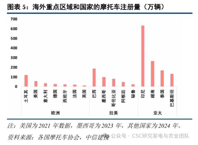 中信建投數(shù)據(jù)顯示,2024年全球摩托車銷量達6000萬輛,摩托車主要市場集中在亞太、拉美和歐美。