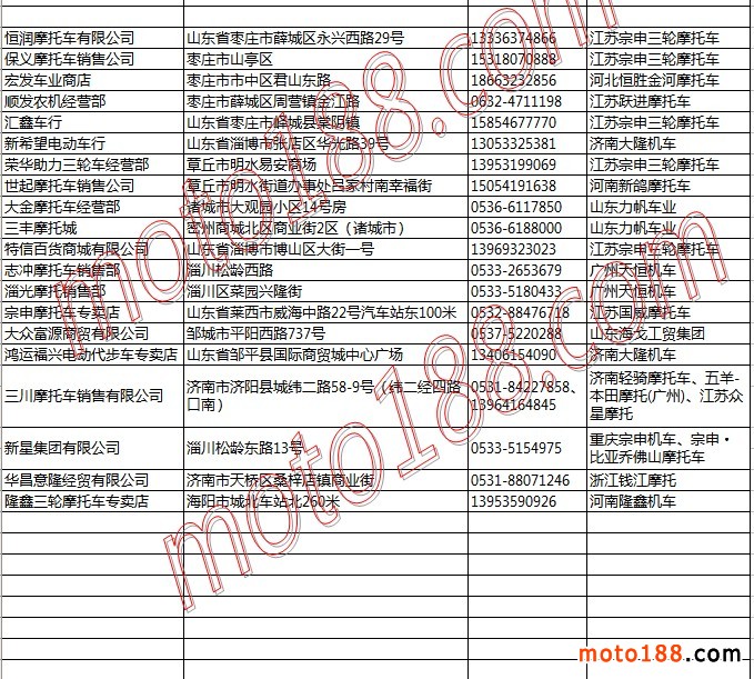 山東省摩托車整車經(jīng)銷商名錄