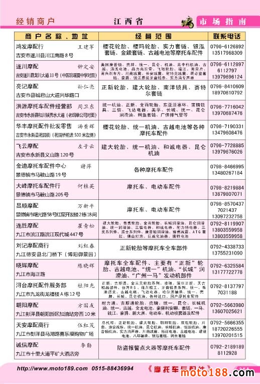 繼第一版《中國摩托車配件市場指南》在市場推行以后,獲得企業(yè)很高的評價,是行業(yè)銷售的工具書,剛開始的《華東》和《中南》推廣難度較大,從第三本《三北》之后,已經(jīng)在市場形成品牌效益,《西南》、《華南》三個版本指南一本比一本做得好,所以我們再接再厲爭取把第二次升級版做得更好。目前全國摩配市場也在日新月異的變化,為了適應市場,我們每幾年進行升級一次,確保企業(yè)銷售人員能通過此書,便于在全國市場的銷售,這是打開各地市場的鑰匙,大家在全摩會結束后,能迅速地熟悉最新的各區(qū)域市場。