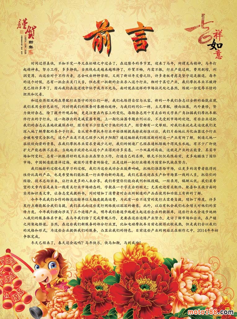 和這些歷經(jīng)風(fēng)雨在摩配行業(yè)堅(jiān)守的同仁們一樣,我們也煉得自信與從容。新的一年我們雜志以全新的面貌出現(xiàn),我們采用全彩色出刊,同時(shí)將我們的服務(wù)對(duì)象橫向延伸。與我們的同仁一樣,立足摩配,橫向拓展,內(nèi)外兼修,努力做好雜志,除了提升外觀品相,更是注重在內(nèi)容上的變化。每期雜志用十頁(yè)左右的文字來(lái)廣角掃描我們摩托車配件行業(yè)的子行業(yè),這一期推出的是減震器專題。上一期化油器專題出刊以后,不光受到市場(chǎng)的歡迎,有些企業(yè)還把我們的雜志認(rèn)真地收藏保存好,因?yàn)橛胁簧傩畔?duì)于他們的生產(chǎn)、經(jīng)營(yíng)都有一定幫助。對(duì)我們來(lái)說(shuō)也是迫使我們更深入地了解摩配的各個(gè)子行業(yè)。自從前年摩托車行業(yè)開始強(qiáng)制提高排放標(biāo)準(zhǔn)以后,我們片面地認(rèn)為化油器這個(gè)行業(yè)會(huì)被電噴完全取代,這個(gè)產(chǎn)業(yè)是不是已經(jīng)步入到夕陽(yáng)期?通過編排我們較深刻的對(duì)這一產(chǎn)業(yè)有所了解,制造之地一派欣欣向榮的景象,在我們摩托車業(yè)需求量減少之時(shí),我們的制造廠已經(jīng)在通機(jī)領(lǐng)域干得風(fēng)生水起,有不少?gòu)S即使擴(kuò)大產(chǎn)能也供不應(yīng)求。當(dāng)?shù)氐胤秸矎倪@個(gè)產(chǎn)業(yè)得到許多實(shí)惠,一個(gè)雙贏的局面,這就是產(chǎn)業(yè)的正能量。其實(shí)市場(chǎng)如何變幻,總有一批做得好的龍頭企業(yè)在努力工作,打造自己的名牌,眼光不僅僅局限面前,更多地瞄準(zhǔn)了國(guó)際市場(chǎng)。中國(guó)制造能漂洋過海,被國(guó)外消費(fèi)者所接受,正是這樣一批行業(yè)精英為國(guó)家和民族在努力。