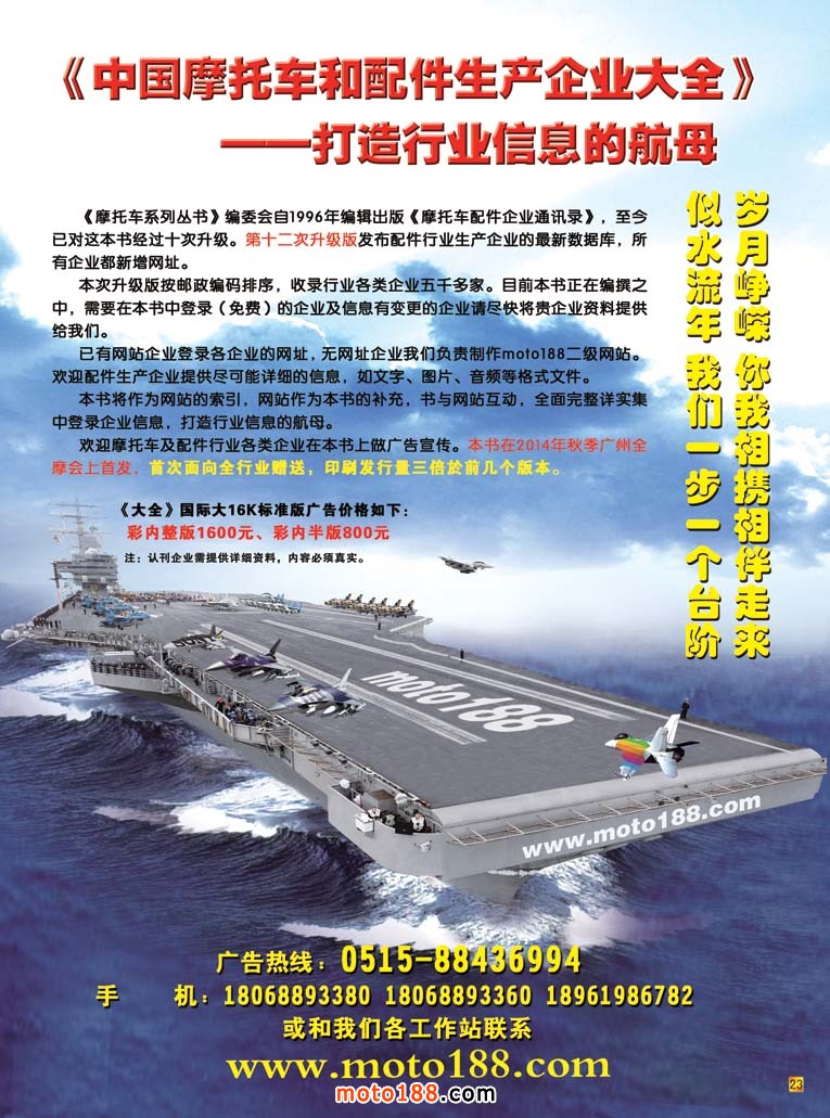 我們雜志在五月份對版面進行了微調,摩托車、電動車、通機等按一定的比例選材編排《摩托車與配件》的外延已經展開,涉及到我們配件行業的相關企業。通過我們對中南地區及華東市場的走訪,我們更加感覺我們調整的及時,緊貼市場。目前摩托車行業在華東地區變化非常大,有昨日黃花之感覺,一些我們以前了解的大戶,曾經門庭若市,現在卻門庭冷落車馬稀,有的不堪門面費用,已轉到倉儲用大篷車送貨銷售。相比而言,中南地區市場變化不算大,在經營數量上還略有增加。摩托車整車市場變化超過了我們配件市場,除了摩托車整車十大品牌還依然屹立,一些小品牌在市場已經很少能看見。這些撤走的小品牌車的門店,變成了電動車和三輪車的門面了,有的甚至是電動四輪車。一些企業稱這些車是新能源汽車,能源肯定是新的,但是作為汽車也稍微寒磣了一點吧。盡管如此,有的地區已經呈現出將要成市的勢頭,但愿這類車在二三線城市不要遭受摩托車的命運。