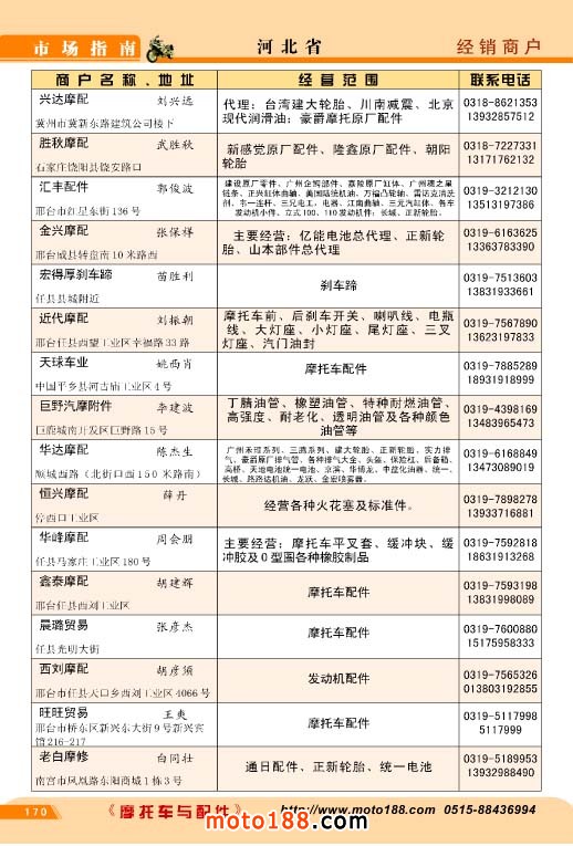 歷時半年,橫跨十三省市的《北方市場指南》今天終于成書,奉獻給行業企業,這本書是我們《中國摩托車配件市場指南》的第三個分冊,也是工作量和難度最大的一本書,為了資料的準確,我們雜志社全體內部工作人員,在炎熱的夏季里,孜孜不倦地工作,先后冒著酷暑兵分三 路去西北、華北、東北的省份,由于夏季暑運高峰,交通也十分不便,有時為了趕路,甚至乘了三十多個小時無空調的大巴車。今天看到這本混合我們汗水和心血的《北方市場指南》我們感覺這份果實更加不同尋常,彌加珍貴。