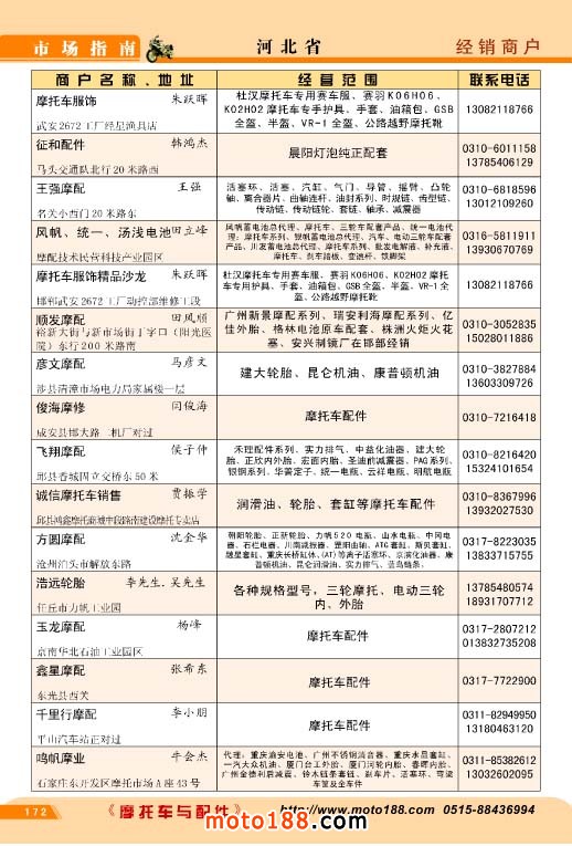 歷時半年,橫跨十三省市的《北方市場指南》今天終于成書,奉獻給行業企業,這本書是我們《中國摩托車配件市場指南》的第三個分冊,也是工作量和難度最大的一本書,為了資料的準確,我們雜志社全體內部工作人員,在炎熱的夏季里,孜孜不倦地工作,先后冒著酷暑兵分三 路去西北、華北、東北的省份,由于夏季暑運高峰,交通也十分不便,有時為了趕路,甚至乘了三十多個小時無空調的大巴車。今天看到這本混合我們汗水和心血的《北方市場指南》我們感覺這份果實更加不同尋常,彌加珍貴。