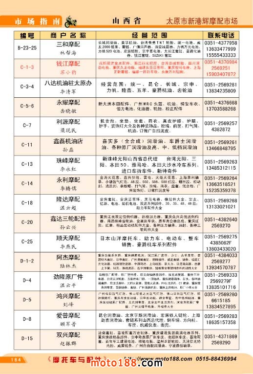 歷時半年,橫跨十三省市的《北方市場指南》今天終于成書,奉獻給行業(yè)企業(yè),這本書是我們《中國摩托車配件市場指南》的第三個分冊,也是工作量和難度最大的一本書,為了資料的準確,我們雜志社全體內(nèi)部工作人員,在炎熱的夏季里,孜孜不倦地工作,先后冒著酷暑兵分三 路去西北、華北、東北的省份,由于夏季暑運高峰,交通也十分不便,有時為了趕路,甚至乘了三十多個小時無空調(diào)的大巴車。今天看到這本混合我們汗水和心血的《北方市場指南》我們感覺這份果實更加不同尋常,彌加珍貴。