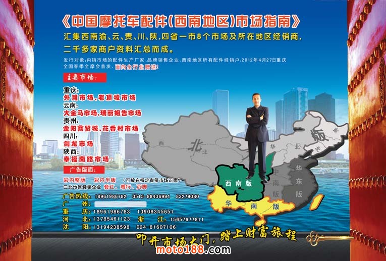 2012年春,行業最具影響力的“春季全摩會”4月27日在重慶召開,我們將在特殊的時間,特 殊的地域,特殊的市場,推出獨具特色的《中國摩托車配件·西南市場指南》,為您的經營提供方向,為您的騰飛插上翅膀。