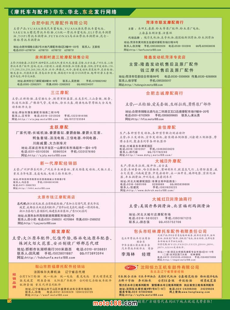 年每月一期,月刊。目前摩托車配件行業雖然只剩我們一家雜志,行業形勢也每況愈下,但我們的印量、發行、價格等均保持不變。根據行業、市場的變化,在明年將增加對三輪車行業及電動車配件行業的信息發布。