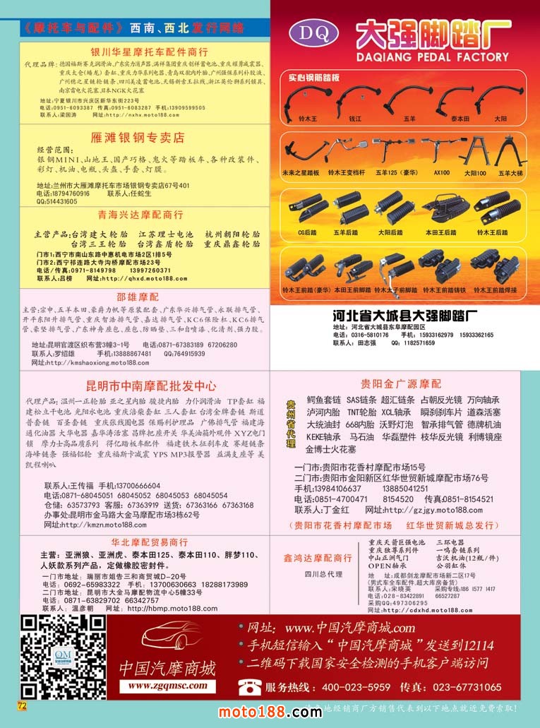 年每月一期,月刊。目前摩托車配件行業雖然只剩我們一家雜志,行業形勢也每況愈下,但我們的印量、發行、價格等均保持不變。根據行業、市場的變化,在明年將增加對三輪車行業及電動車配件行業的信息發布。