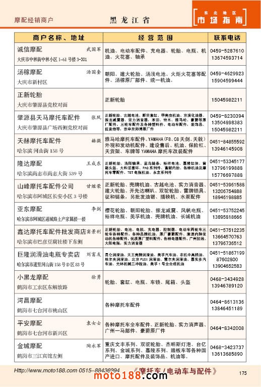 中國摩配市場從上世紀(jì)九十年代開始經(jīng)過高速度的發(fā)展,正逐步減速,摩托車行業(yè)也漸呈式微,與之緊密相關(guān)的后市場的配件與維修也呈逐步下滑之勢,取代摩托車的在發(fā)達(dá)地區(qū)是汽車,欠發(fā)達(dá)地區(qū)是電動兩輪、電動三輪,甚至電動四輪車,隨著經(jīng)濟(jì)的發(fā)展,出行的多樣化,也給了消費(fèi)者多重的選擇。目前現(xiàn)有的摩托車及配件市場,也不再是以純摩托車為主體,有的市場電動車取代了摩托車,有的商店也是混合經(jīng)營,這些變化在《市場指南》里面都有所反應(yīng)。這次《北方指南》一些小市場不再單列,并入到相應(yīng)的省份中去;以前去市場的公交線路,書中也不再列入,因?yàn)楝F(xiàn)在的地圖導(dǎo)航功能十分強(qiáng)大,既新又準(zhǔn)。