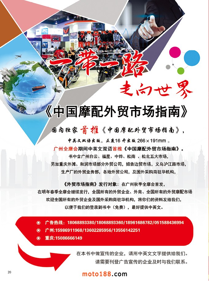 今年十一月份中汽全摩會繼續(xù)在廣州召開,為了做好外貿(mào)服務(wù)工作,抓住一帶一路走向世界的發(fā)展契機,我們將我們的外貿(mào)數(shù)據(jù)庫整理發(fā)布給業(yè)內(nèi)人士,在廣州全摩會正式推出首版《中國摩配外貿(mào)市場指南》,用中英文雙語出版,正度16開,尺寸為266×181毫米。