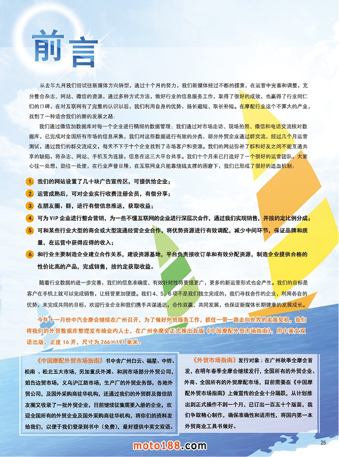 《外貿市場指南》發行對象:在廣州秋季全摩會首發,在明年春季全摩會繼續發行,全國所有的外貿企業、外商、全國所有的外貿摩配市場,目前需要在《中國摩配外貿市場指南》上做宣傳的企業十分踴躍,從計劃推出到正式操作不到一個月,已訂出一百五十個版面,我們爭取精心制作,確保準確性和適用性,將國內第一本外貿商業工具書做好。