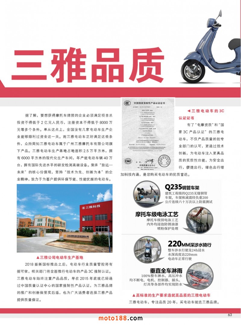 2018.3月《摩托車/電動車與配件》雜志,歡迎大家閱讀日期:2018-03-06 點(diǎn)擊:1281 查看原圖 全部展開![]() ![]() ![]() 內(nèi)63 3C認(rèn)證加電摩資質(zhì)助力三雅品質(zhì)