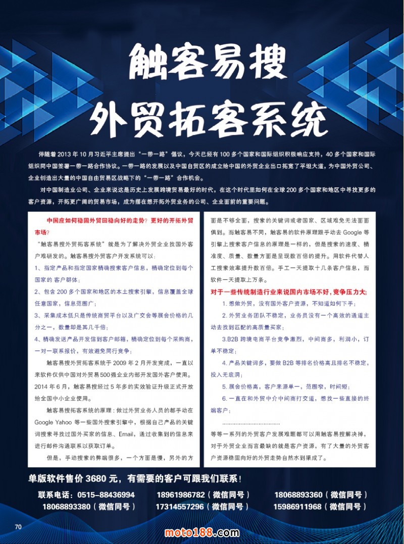 3、為了突破傳統(tǒng)的營銷手段和模式,充分發(fā)揮互聯(lián)網(wǎng)的作用。我們向行業(yè)引進了幾款外貿(mào)及小程序軟件,通過互聯(lián)網(wǎng)絡,運用軟件搜索,尋找全球的摩托車配件買家。