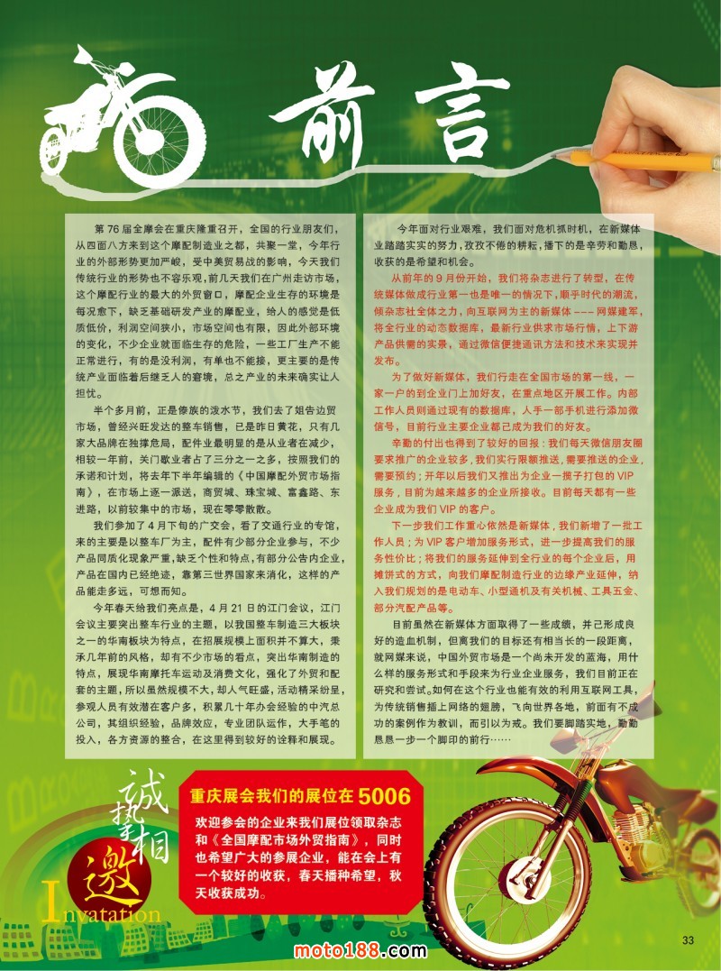 重慶展會我們的展位在5006,歡迎參會的企業來我們展位領取雜志和《全國摩配市場外貿指南》,同時也希望廣大的參展企業,能在會上有一個較好的收獲,春天播種希望,秋天收獲成功。