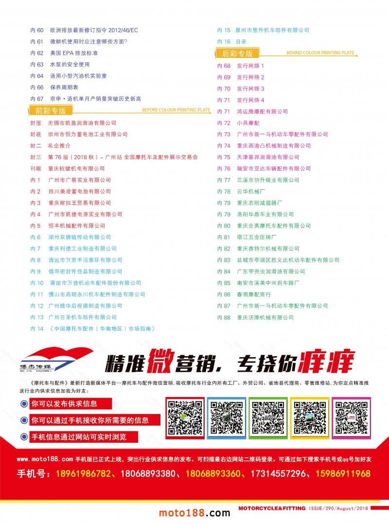 從現(xiàn)在到10月上旬,我們還將對16年編撰的《摩配華南市場指南》進(jìn)行升級,中英文雙語出版,新版本將在下半年第76屆廣州全國摩托車及配件展示交易會(huì)首發(fā);并在廣州重慶摩配市場全面派送;在廣州福星、松南市場門口、及白云210/002/607三個(gè)檔口常年設(shè)立發(fā)行窗口;發(fā)行至廣州、重慶、江浙的主要廠家,目前收集整理、核對校正信息,編排翻譯的工作正在進(jìn)行之中,需要在最新《華南市場指南》升級版做宣傳的企業(yè),請和我們以及各地的工作站人員聯(lián)絡(luò)。