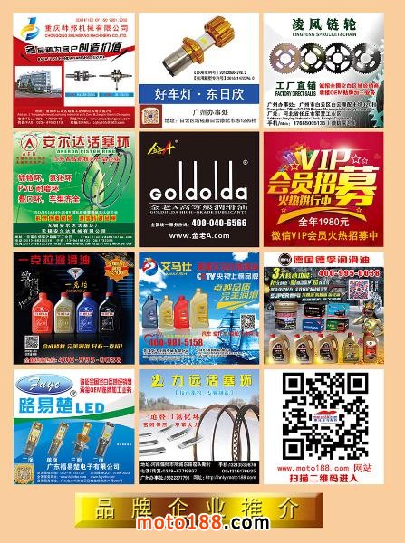 從現在到10月上旬,我們還將對16年編撰的《摩配華南市場指南》進行升級,中英文雙語出版,新版本將在下半年第76屆廣州全國摩托車及配件展示交易會首發;并在廣州重慶摩配市場全面派送;在廣州福星、松南市場門口、及白云210/002/607三個檔口常年設立發行窗口;發行至廣州、重慶、江浙的主要廠家,目前收集整理、核對校正信息,編排翻譯的工作正在進行之中,需要在最新《華南市場指南》升級版做宣傳的企業,請和我們以及各地的工作站人員聯絡。