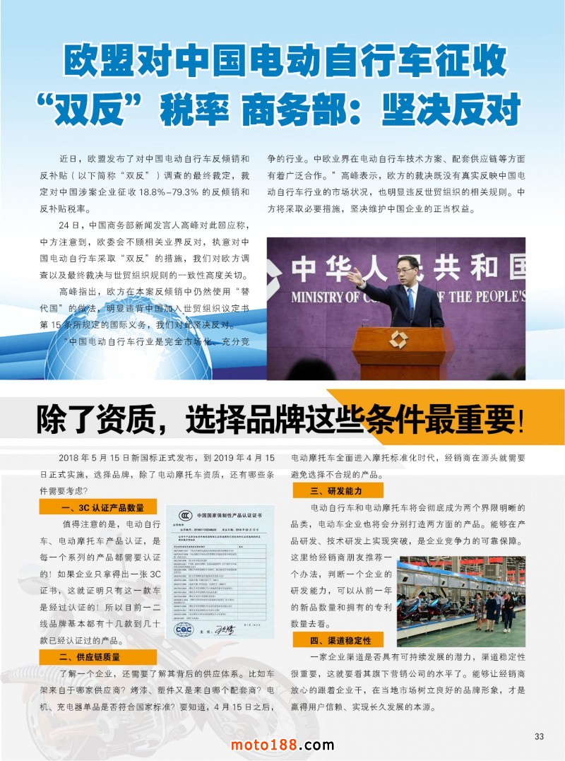 2019.5月《摩托車/電動車與配件》雜志,歡迎大家閱讀日期:2019-05-08 點(diǎn)擊:1857 查看原圖 全部展開![]() ![]() ![]() 內(nèi)33 歐盟對中國電動自行車征收“雙反”稅率 商務(wù)部:堅(jiān)決反對