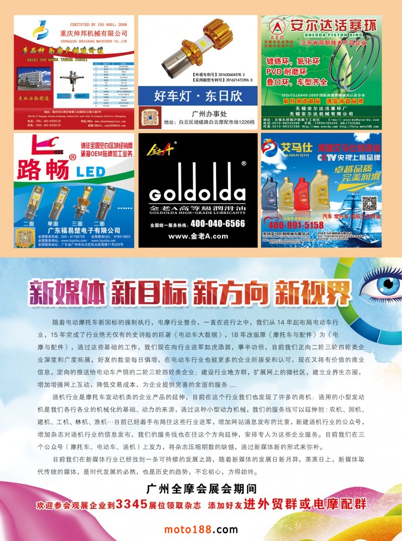 今天在廣州,我們又迎來了行業的盛事: 第78屆(2019年秋)全國摩托車及配件展示交易會在廣州保利世貿博覽館正式開展,這是一年一度的行業盛會,是主辦單位為從事摩托車配件業及電摩配件業出口貿易而精心打造的一個平臺,國內大部分從事進出口的企業,都不會放棄這樣的機會展示自己,開拓市場,發展客戶;海外采購商萬里迢迢,不辭路遠,愿行業同仁在這次會議上能獲得較好的展會效果,獲得訂單。 面對多年的電摩配行業不景氣,媒體業也面臨更多的挑戰,在挑戰面前,我們主動求變,并在新媒體業完成了華麗的轉身: