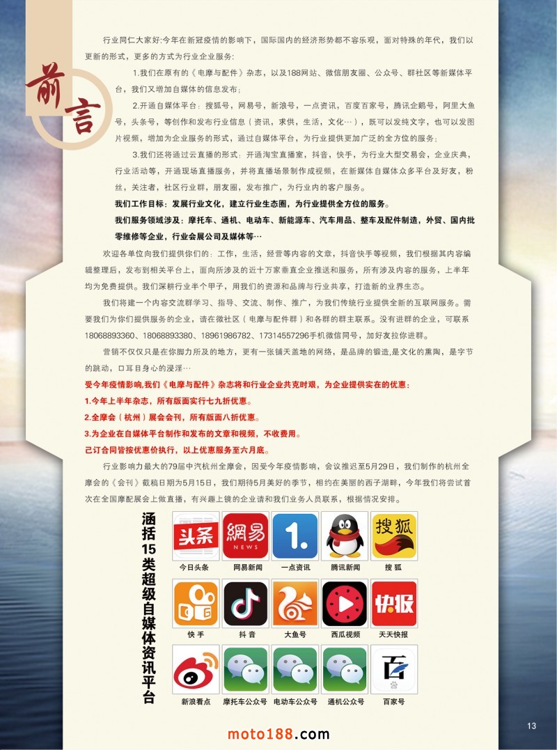 1.我們在原有的《電摩與配件》雜志,以及188網(wǎng)站、微信朋友圈、公眾號、群社區(qū)等新媒體平臺,我們又增加自媒體的信息發(fā)布;