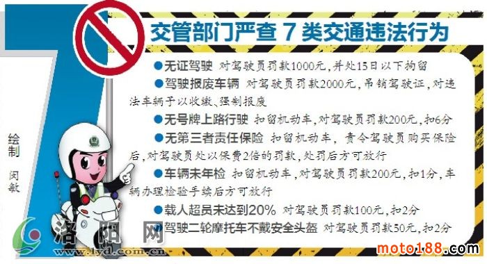 此外,市交管支隊還將依照相關法律法規,對三輪車、摩托車無號牌上路行駛,駕駛員無證駕駛等7類交通違法行為開展重點治理。(違法行為和所獲相應處罰詳見圖表)